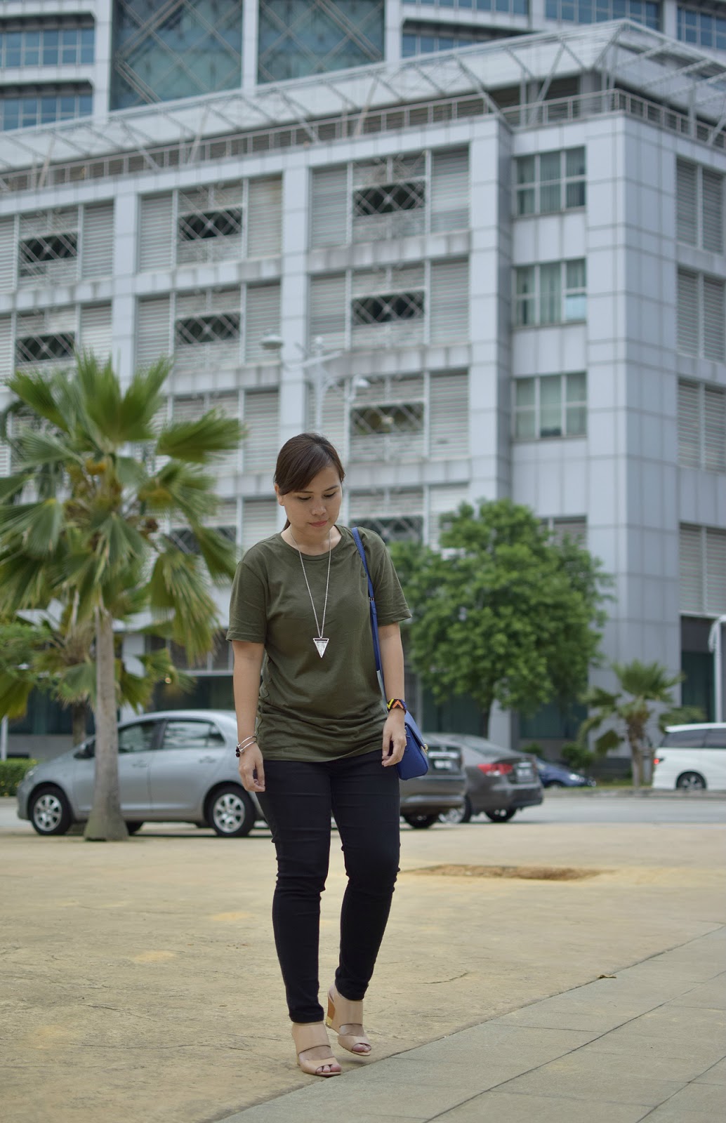 Pairing this olive green shirt quite challenging for me, I need to avoid it look so manly and too casual and I need to make it look girlish. So, I pairing it with some girlish items such as my nude shoes which people said can make our legs look taller.
